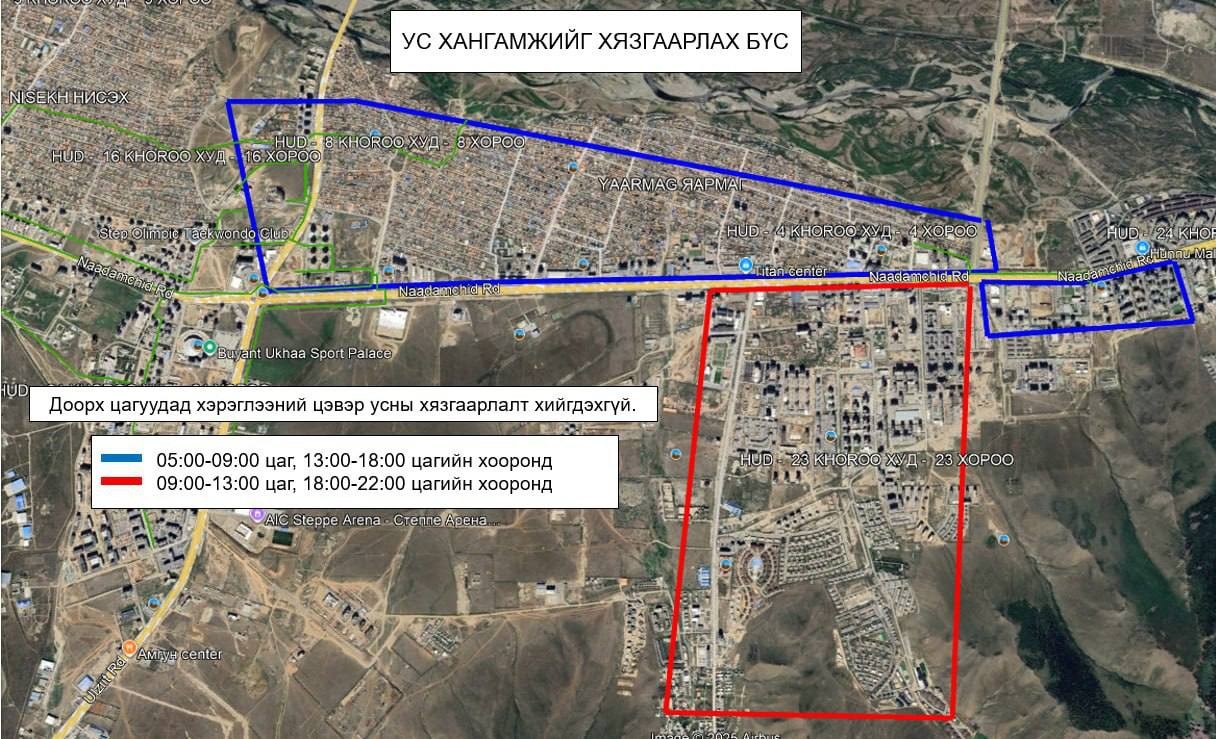 Нийслэлийн ХУД-ийн 5,6,7,23,24 дүгээр хороон дахь орон сууцны хэрэглээний усыг өнөөдрийн (2025.11.06) 22:00 цагаас арваннэгдүгээр сарын 8-ны өглөөний 08:00 цаг хүртэл хэсэгчилсэн байдлаар хязгаарлахаар болжээ.