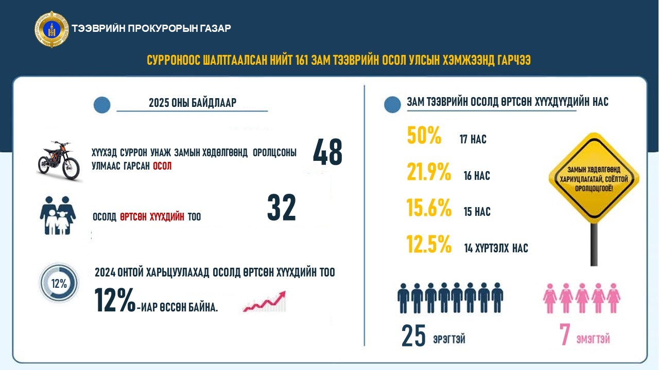 Тээврийн прокурорын газраас эцэг, эхчүүд, асран хамгаалагч, сурган хүмүүжүүлэгч та бүхнийг өсвөр насны хүүхдэдээ тавих анхаарлаа сайжруулж, учирч болох эрсдэлийн талаар ойлгуулж, замын хөдөлгөөний дүрмийг баримталж, осол аваараас урьдчилан сэргийлэхийг уриаллаа