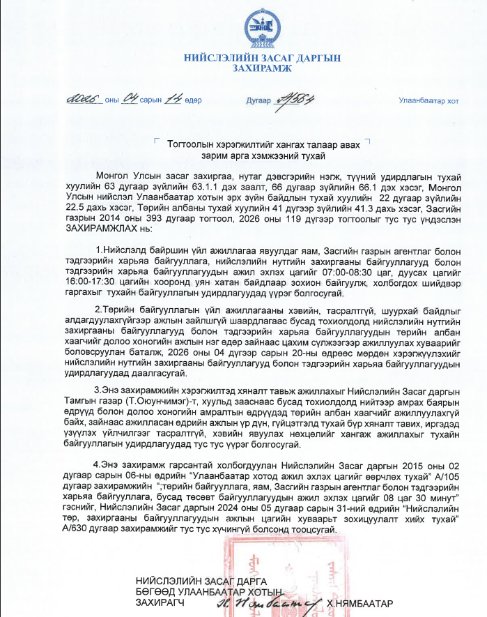 2026 оны 4 дүгээр сарын 20-ны өдрөөс эхлэн төрийн байгууллагын үйл ажиллагааны хэвийн, тасралтгүй, шуурхай байдлыг алдагдуулахгүйгээр ажлын зайлшгүй шаардлагаас бусад тохиолдолд нийслэлийн төр, захиргааны байгууллагын албан хаагчид долоо хоногийн нэг өдөр зайнаас цахимаар ажиллана.